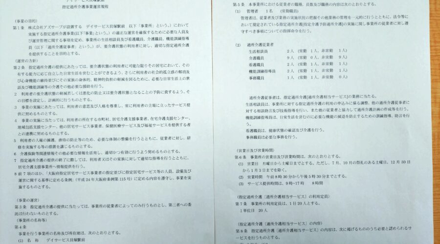 デイサービス貝塚駅前の運営規定を掲示いたします。ご不明な点がございましたらご連絡ください。